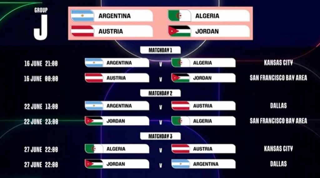 La Selección argentina, dirigida por Lionel Scaloni, jugará la primera fase en el centro de Estados Unidos, donde compartirá el Grupo J junto a selección de Argelia, selección de Austria y selección de Jordania.